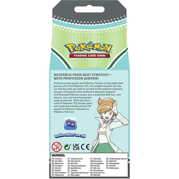 Professor Juniper guides new Pokémon Trainers as they begin their journey, and in the Pokémon TCG, her in-depth research can help you find the cards you need to succeed! In this premium collection, you get a full playset of the Professor’s Research Supporter card featuring Professor Juniper, plus a protective deck box, card sleeves, coin, and more tournament-ready accessories. You’ll also find a stack of Pokémon TCG booster packs and a code that unlocks another full playset of Professor’s Research in Pokémon TCG Live!